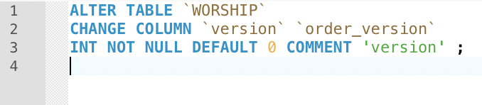 WORSHIP 테이블의 version 컬럼을 변경하는 쿼리이다.